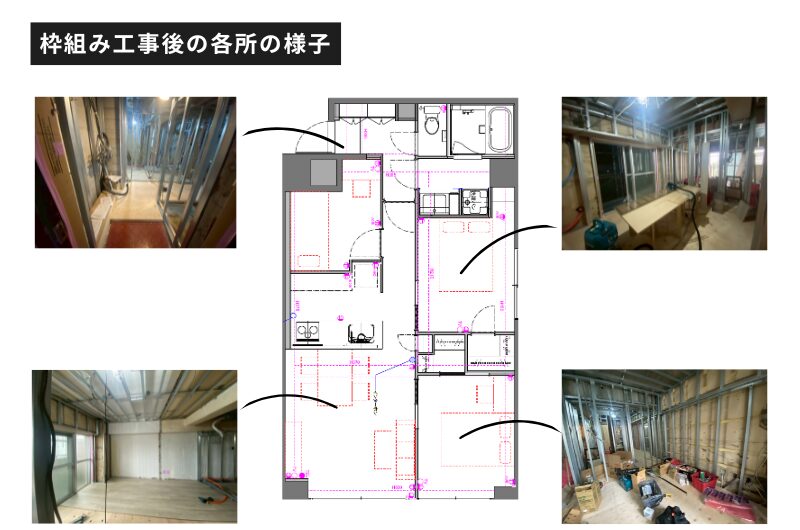 既存の壁や設備を解体し、新しい住まいの骨組みをつくる作業がスタートしました。