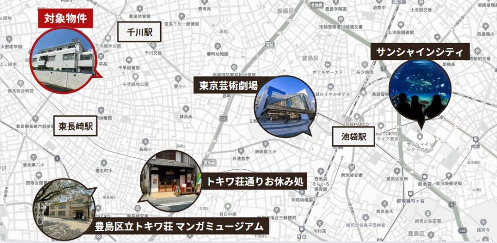 対象物件は、池袋の賑やかな繁華街から少し離れた場所にあり、池袋駅から2駅の東長崎駅と千川駅の中間に位置する低層住宅地の落ち着いた雰囲気が特徴です。どちらの駅前にも大型スーパーや飲食店が揃い、特に東長崎駅周辺には商店街があり、地域の温かみを感じられるお店が並んでいます。都市部へのアクセスと穏やかな住環境が調和した、暮らしやすいエリアといえます。