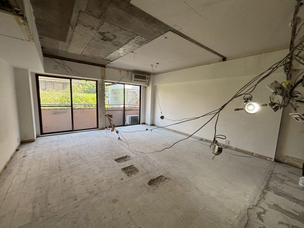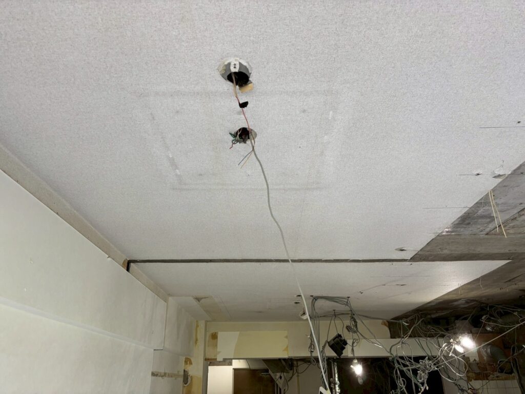 天井は躯体に直接クロスが貼られている「直貼り」であることが判明しました。そのため、照明器具を設置するには天井を6~7㎝下げる必要があります。フルスケルトン時には天井高が2.45mありましたが、床上げも含めた工事により最終的には2.3mを目標として確保していきます。