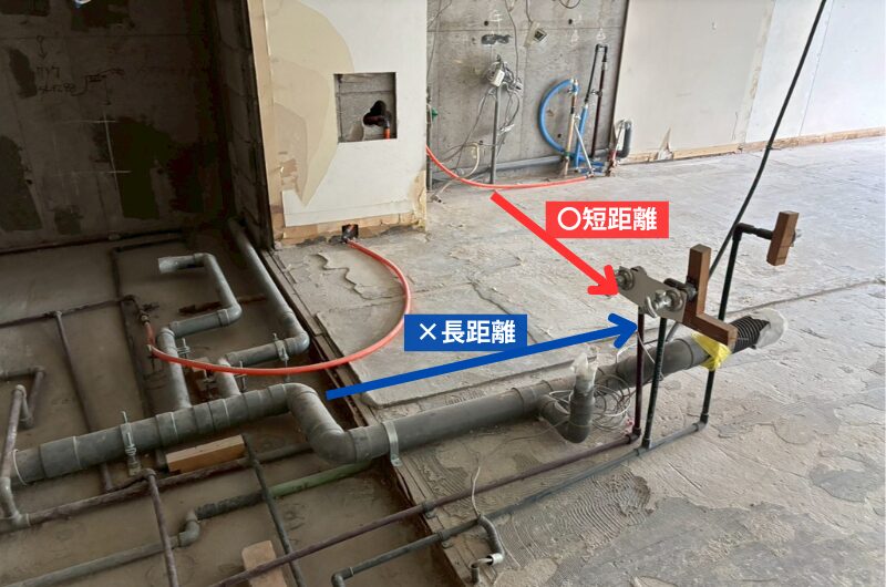給排水管を通すには傾斜が必要となるため、どの位置から配管するかを検討した結果、床の高さを最小限に抑えられるWIC側から給水をとることにしました。