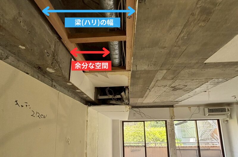 解体前の部屋もリノベーションされており、配管ダクトの位置に合わせて造作していたため、梁(ハリ)の幅が大きく取られていました。今回はその幅を最小限に調整します。