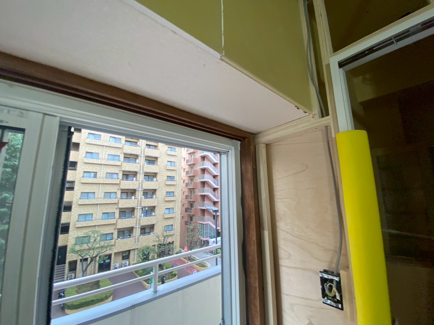 サッシ周りには枠を取り付けて、洋室の雰囲気に合うように仕上げます。これまで障子だった箇所も、カーテンレールの取り付けが可能となり、今後さらに加工が進められる予定です。