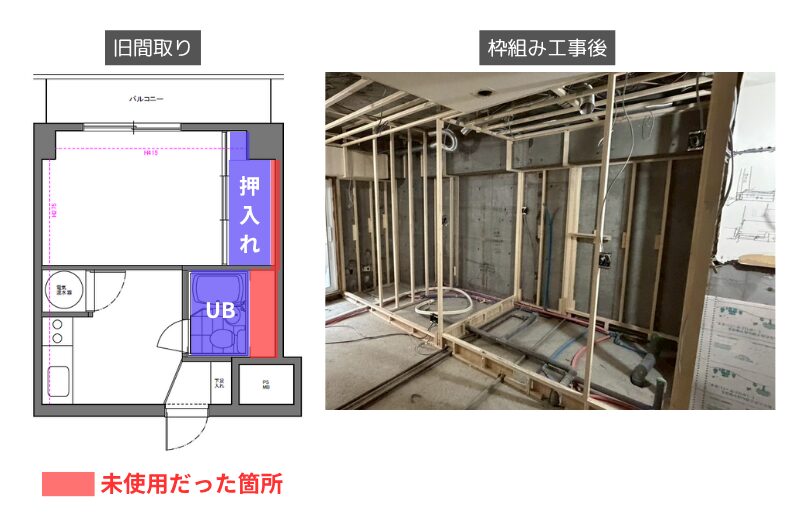 浴室の裏には謎の空間と梁があり、旧間取りでは梁を避ける形でUBや押入れが設置されていました。今回は、この空間1㎝も無駄にせず、梁に合わせて浴室を加工し、空間を最大限に活かす設計に作り直します。