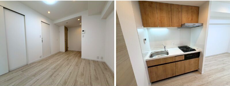 今回のリノベーションでは、1Kの壁を取っ払って1Rに変更し、廊下やドアを減らすことで使えるスペースを広く確保します。