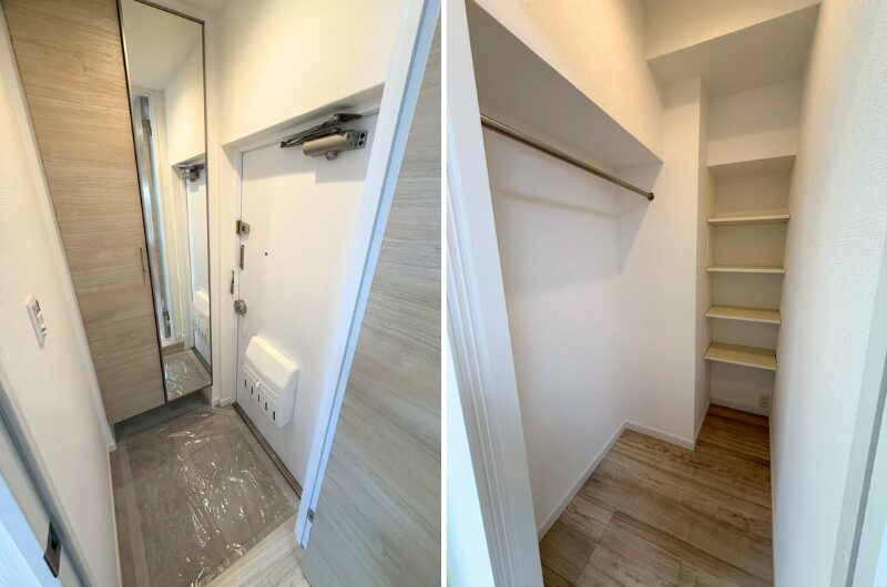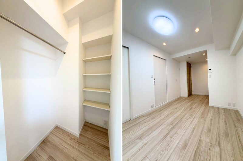 バルコニー側のスペースにはウォークインクローゼット(WIC)が設置されます。正面には稼働棚が配置され、梁(ハリ)の下にはパイプハンガーが取り付けられる設計です。どちらも梁下のスペースを有効に活用しています。