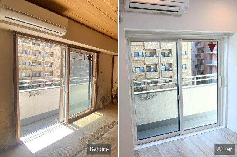 このサッシは管理組合の工事で設置されたもので、今回は手を加えられません。そこで、障子の雰囲気を活かしつつ、洋室に合うよう窓まわりを加工して仕上げています。